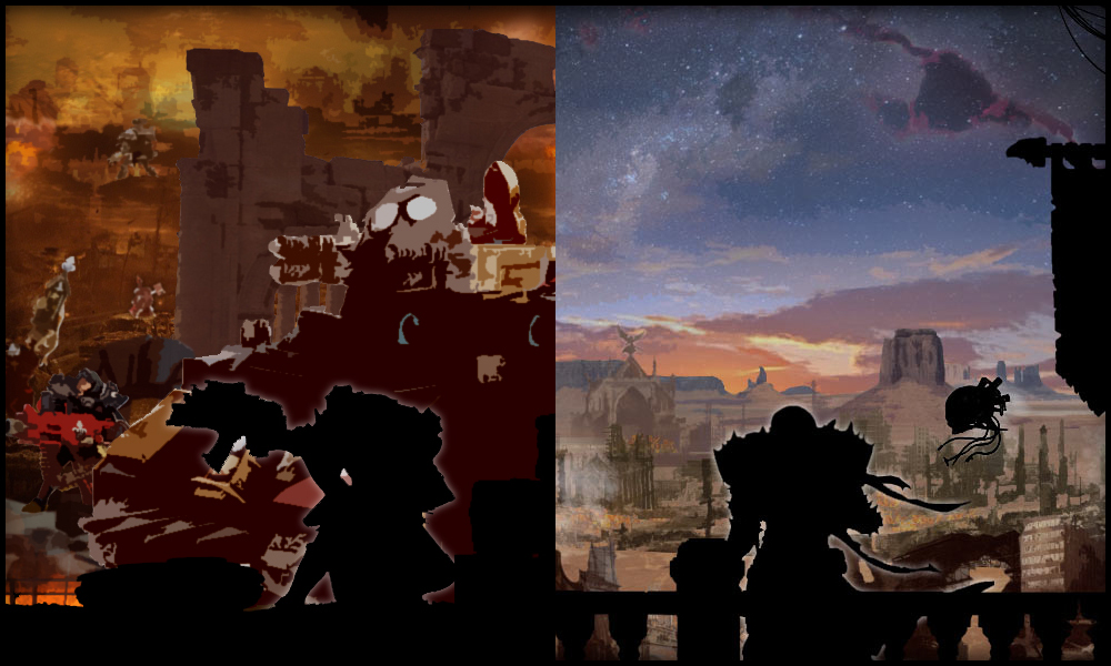 The first picture shows a look upon the ruined Arios Prime from the view of Canoness Valeena. While a second picture shows war in the burning ruins of the capitol city.
